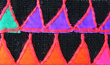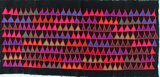 | igo01-r アカ族刺繍yama:縦21.5cm×横54cm(刺繍部分の大きさ) 黒地に三角のモチーフを貼り付けその周りを手でステッチしています。縁は切りっぱなしで未処理です。 アカ族の女の子はスカートやシャツの襟にあしらってオシャレします。 |